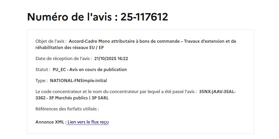 | Date de publication sur le serveur | 20 octobre 2025 | Date de clôture | lundi 24 novembre 2025 - 12:00 (heure locale du pouvoir adjudicateur) | |||||